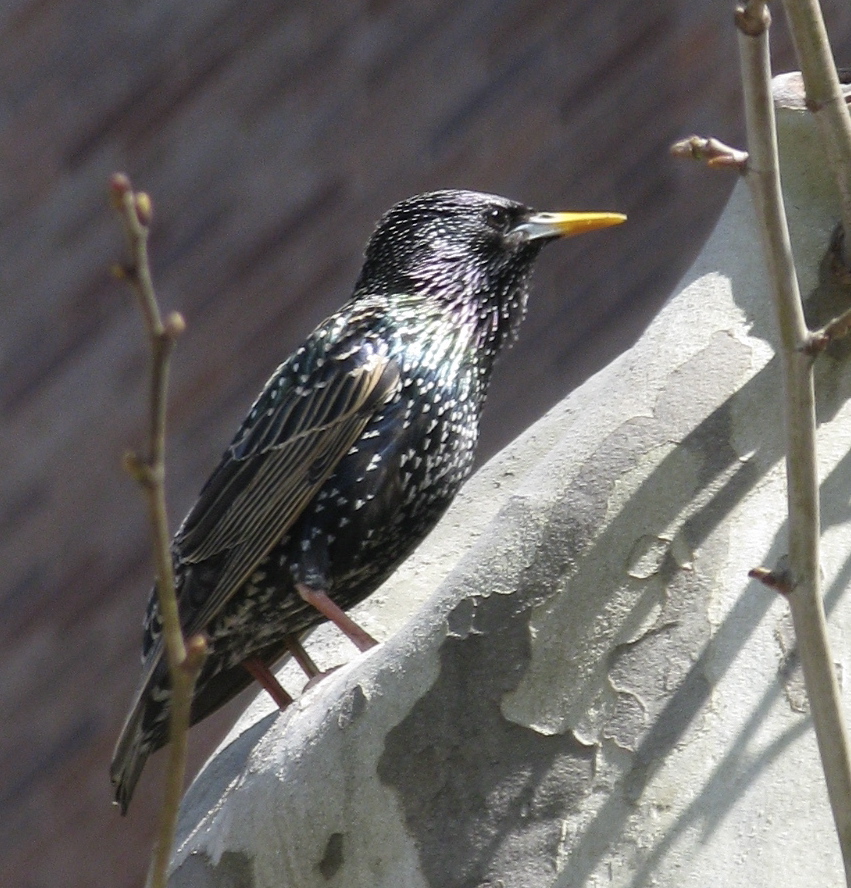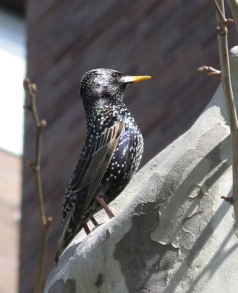 The European Starling, rather vulgarly branded by the taxonomists as Sturnus vulgaris, was introduced to New York because some idiot wanted to see all of Shakespeare’s birds in the New World. Cf. “I’ll have a starling shall be taught to speak/Nothing but ‘Mortimer,’ and give it him/To keep his anger still in motion.” ~ Hotspur, First Henry IV, playing on the mimicry characteristic of the species.