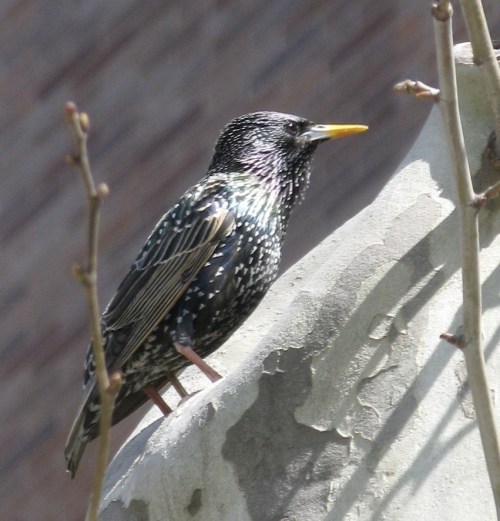 Some things to know about Starlings: their beaks are yellow only during breeding season, being blackish the rest of the year. Their non-breeding plumage shows many white marks, as here, for this individual has yet to take on the glossy, greenish-purplish black of full breeding plumage. In the air, they look like no other bird with their triangular wings and short square tail. In some regions, they mass in the tens of thousands, darkening the sky like clouds. They can make a great range of sounds, including what sounds just like the classic “wolf-whistle.” And yes, you probably could train one to squawk “Revolted Mortimer!” Also, they are fighters.