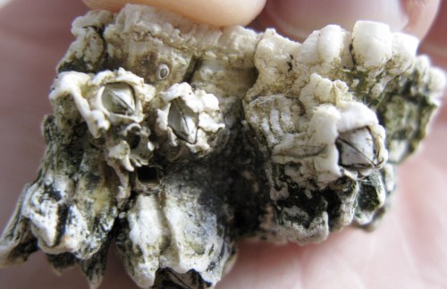 A barnacle, as Cirripedia-mad Charles Darwin discovered, is actually a crustacean, akin to crabs and lobsters. A free-swimming animal in its youth, it has two distinctive larval stages, wonderfully called nauplius and cyprid. Then after swimming through several instars, most barnacle species settle down, literally, gluing themselves head/forehead first to a rock, pier, ship’s hull, or some such surface, and enveloping themselves within a carapace-like shell made up of (usually) six plates for an immobile maturity. The references to ship’s hull is a matter of some economic seriousness; humans have been scraping barnacles off boats since we took to the sea. The beak-like barn doors that protect the soft animal within its calcium fortress are visible in the above image; when feeding, these open to allow feathery modified legs that pull in plankton from the water. Barnacles at the mercy of the tide hunker down during the hours of low tide.