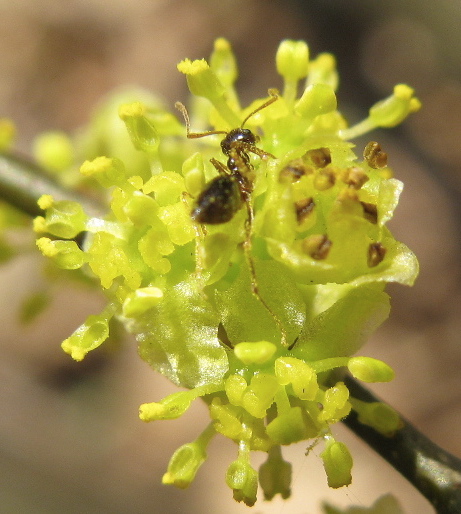 Sometimes you don’t notice the details (or the scandalously narrow field of focus) of a macro shot until later. Check out these great big antenna, like something you’d find on long-horned cattle. This worker ant is busy on that understory delight Spicebush, Lindera benzoin.