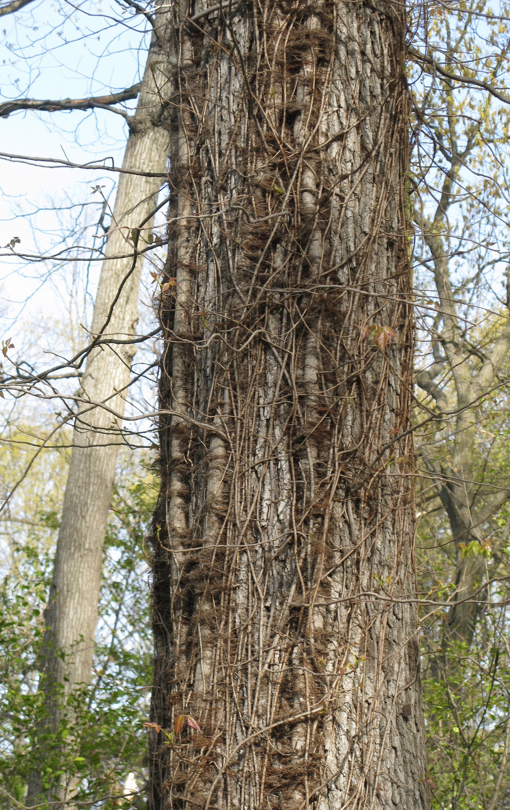 Prospect Park’s Poison Ivy, Toxicodendron radicans, has leafed out. This is only one version of this very variable plant, which can be a shrub, a trailing vine, or a climbing vine. Old vines snaking up trees are hairy beasts, often with horizontal twigs.