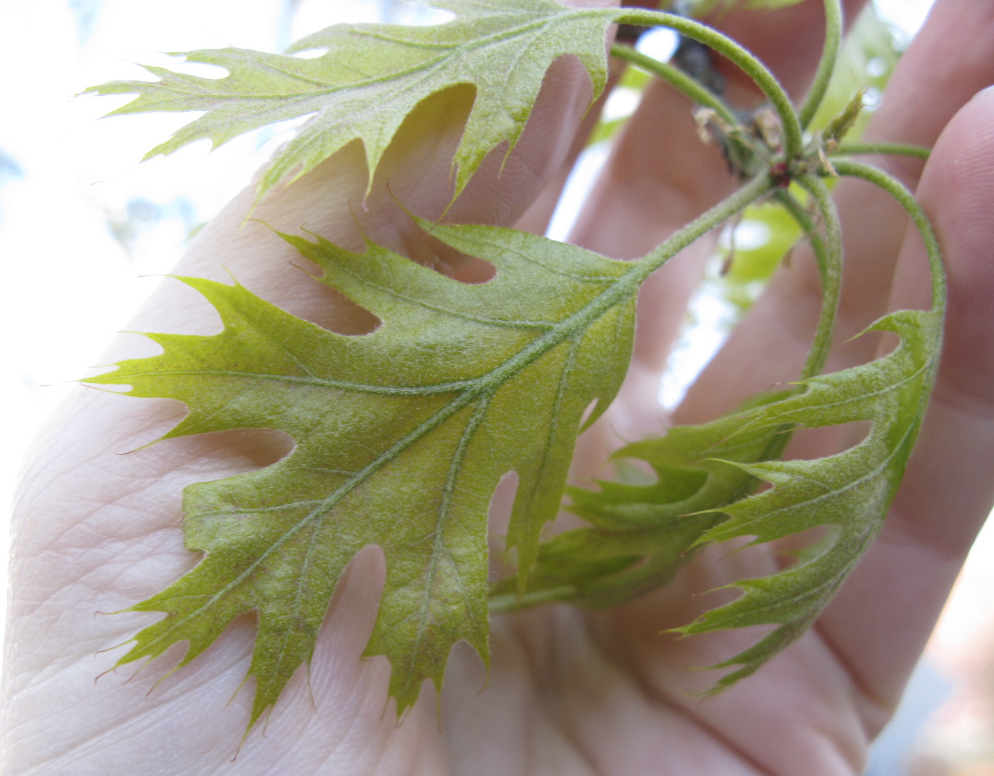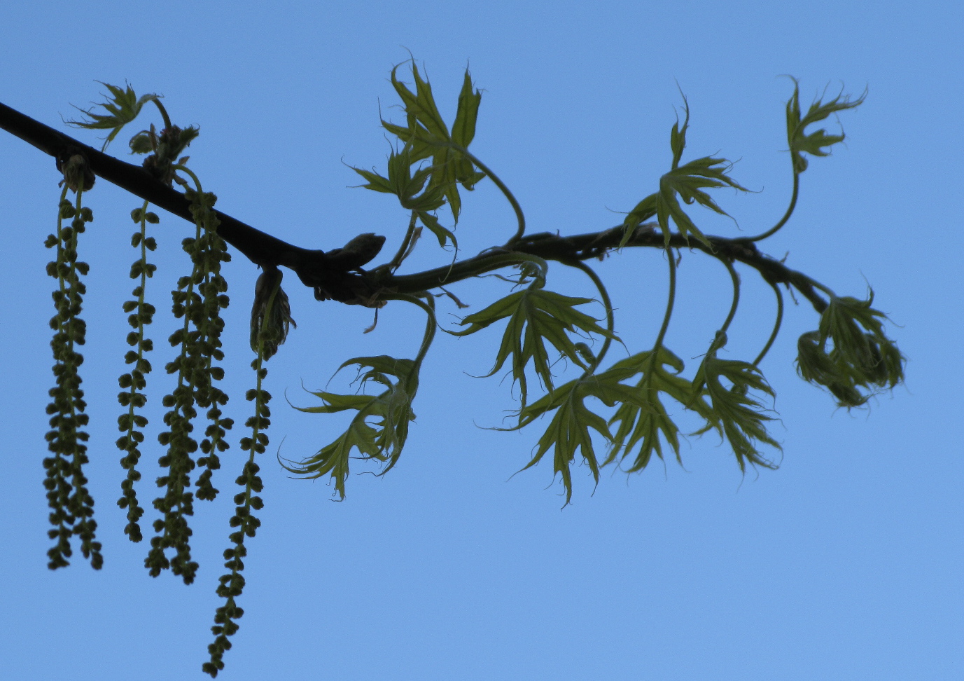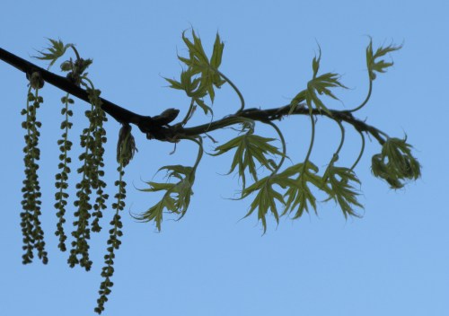 Oaks are wind-pollinated, so they do not have showy, pollinator-attracting flowers. Instead, the flowers are small and hang in catkins. This is probably our old friend Pin Oak, an assumption I make because of the deep sinuses in the very fresh leaves.