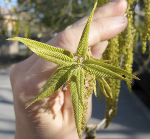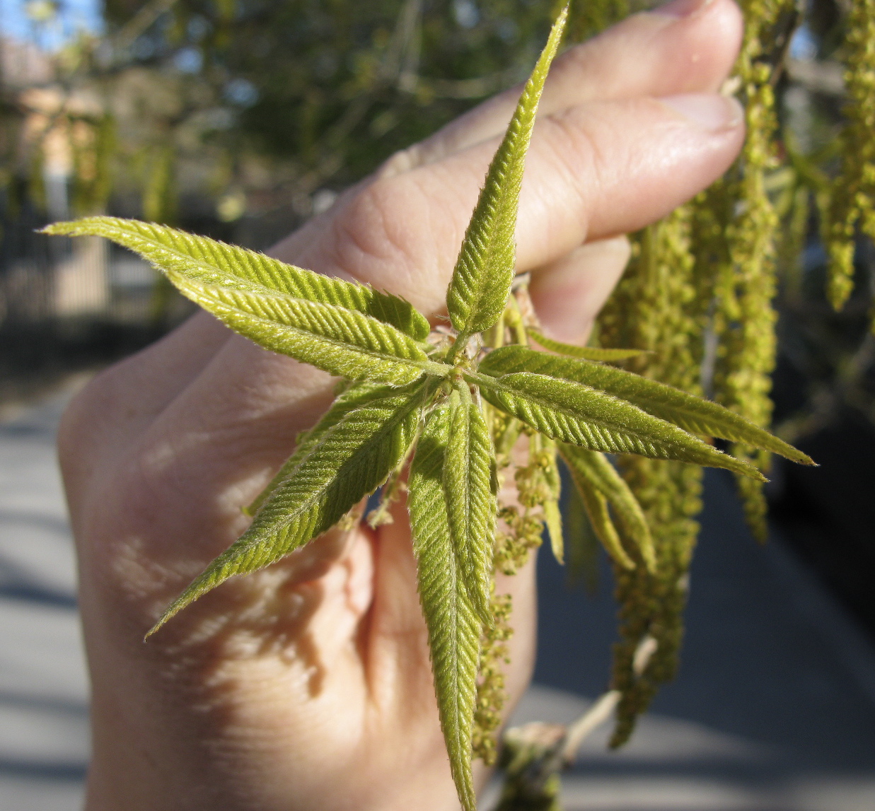 Now, note the catkins in the background of this one. Even though these are baby leaves are quite un-oak-like, this is in fact another atypical oak, the Sawtooth Oak (Q. acutissima). The tree is native to western Asia and Japan, and hence in neither the Red or White group, but rather the “exotic” group. It is found on both our streets and parks. It produces substantial acorns with very hairy caps every two years.