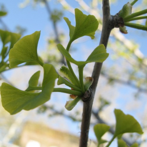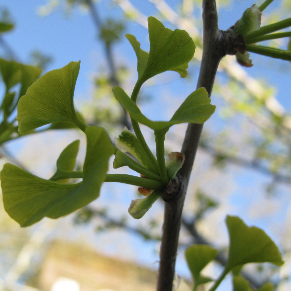 The distinctive fan-shaped leaves of the Ginkgo (Ginkgo biloba). Here they are finger-nail sized as they sprout off the stubby “spur twigs.” Everything about the Ginkgo is unique. It has no living relatives. 270 million year old fossils of the tree are nearly identical to living specimens today. It’s even in its own division in the kingdom Plantae: Ginkgophyta, while all the evergreen trees are in Pinophyta and all the broadleaf trees are in Magnoliophyta.