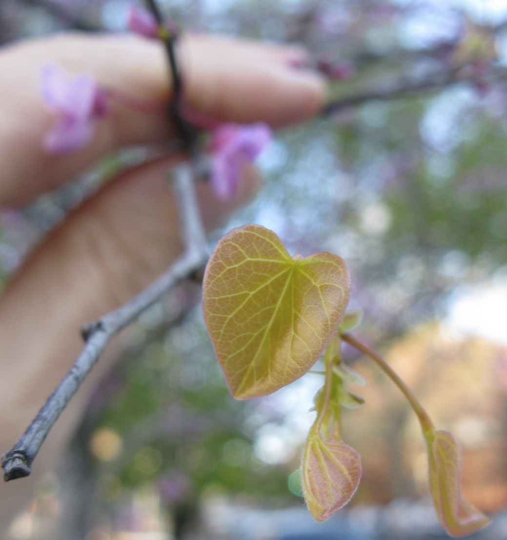The heart-shaped leaves of Eastern Redbud (Cercis canadensis). This tree is unmistakable when in bloom, the little pink flowers all along its branches, but it becomes a bit more obscure then the flowers drop away. But these heart-y leaves will get to be 4″ across, so look for them later in the spring and the summer.