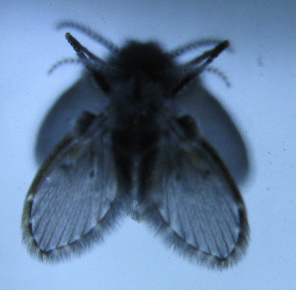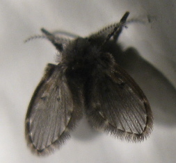 Well, trouble no more, you’ve discovered the subfamily Psychodinae, the moth flies. Yes, it’s a confusing name, sort of like “spider beetles”. These are also known as drain flies since they breed in the rich bacterial slime that collects in home drains. (Ahem, present company excepted, of course.)