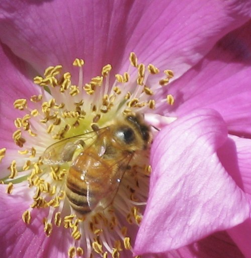 Honey-colored honey bee in beach rose.