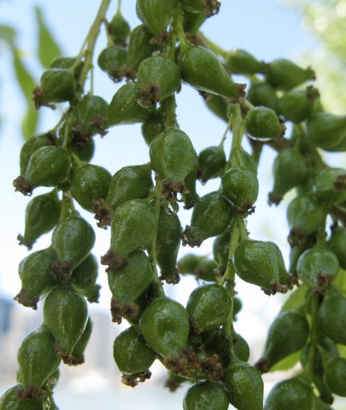 Sticky green fruits of Eastern cottonwood. These will eventually split open to release the cottony fluffs that carry the seeds far and wide.