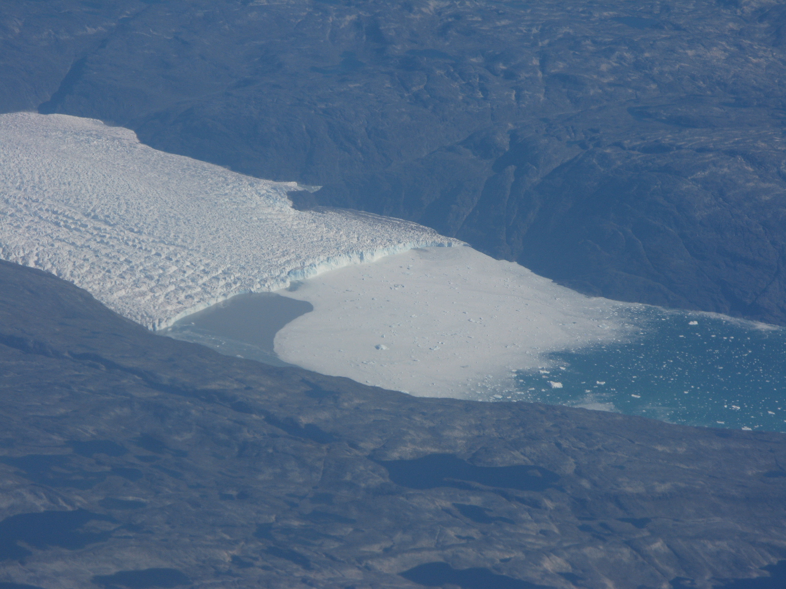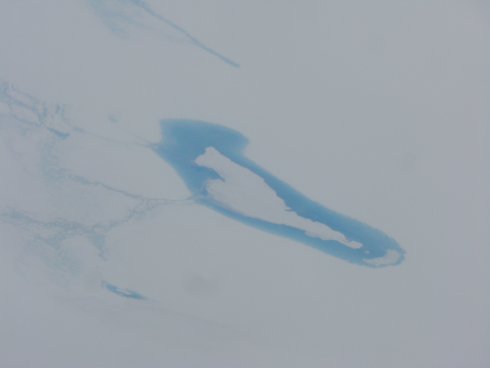 There was a point, deep inland over the ice, where everything visible below was white. I wondered if we were flying upside-down, so cloud-like was the vista. But then there were these huge patches of blue.