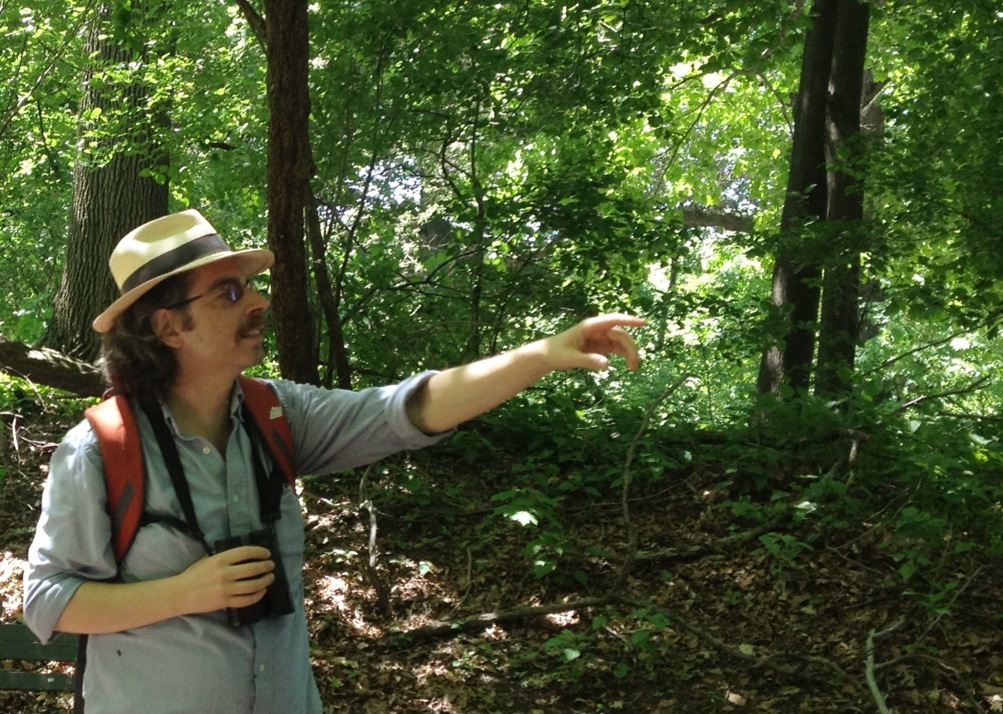 And in a rare personal appearance, your blogger, and Mrs. Wills’s son, points not to the glorious dream of a Soviet future à la Lenin nor to the Cape May warbler we saw practically eye-to-eye in the Vale of Cashmere yesterday, but to another of the stuffed teddy bears and My Little Ponies hanging from the trees. Art project or psycho-creepiness? So hard to tell sometimes in that neck of the woods. Photo by Traci.