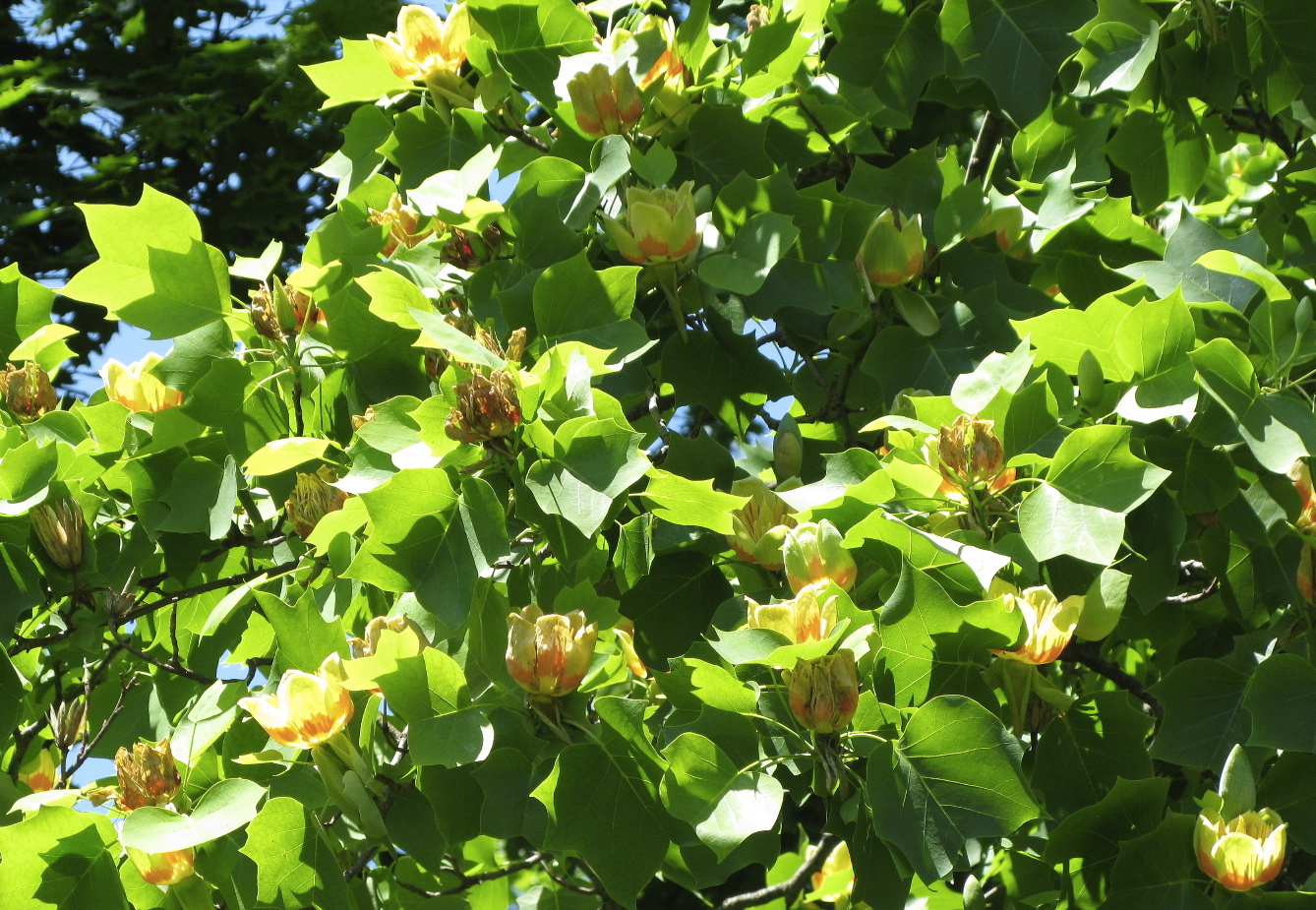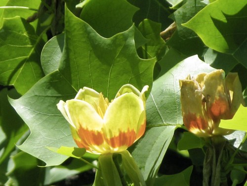 The flowers of the Tuliptree (Liriodendron tulipifera) are often way up high, since this is one of the tallest trees on the East Coast, and the species tends to shoot straight up, racing for the sun. Elizabeth’s Tuliptree overlooking Nelly’s Lawn in Prospect Park has a branch that dips low, but not too low.