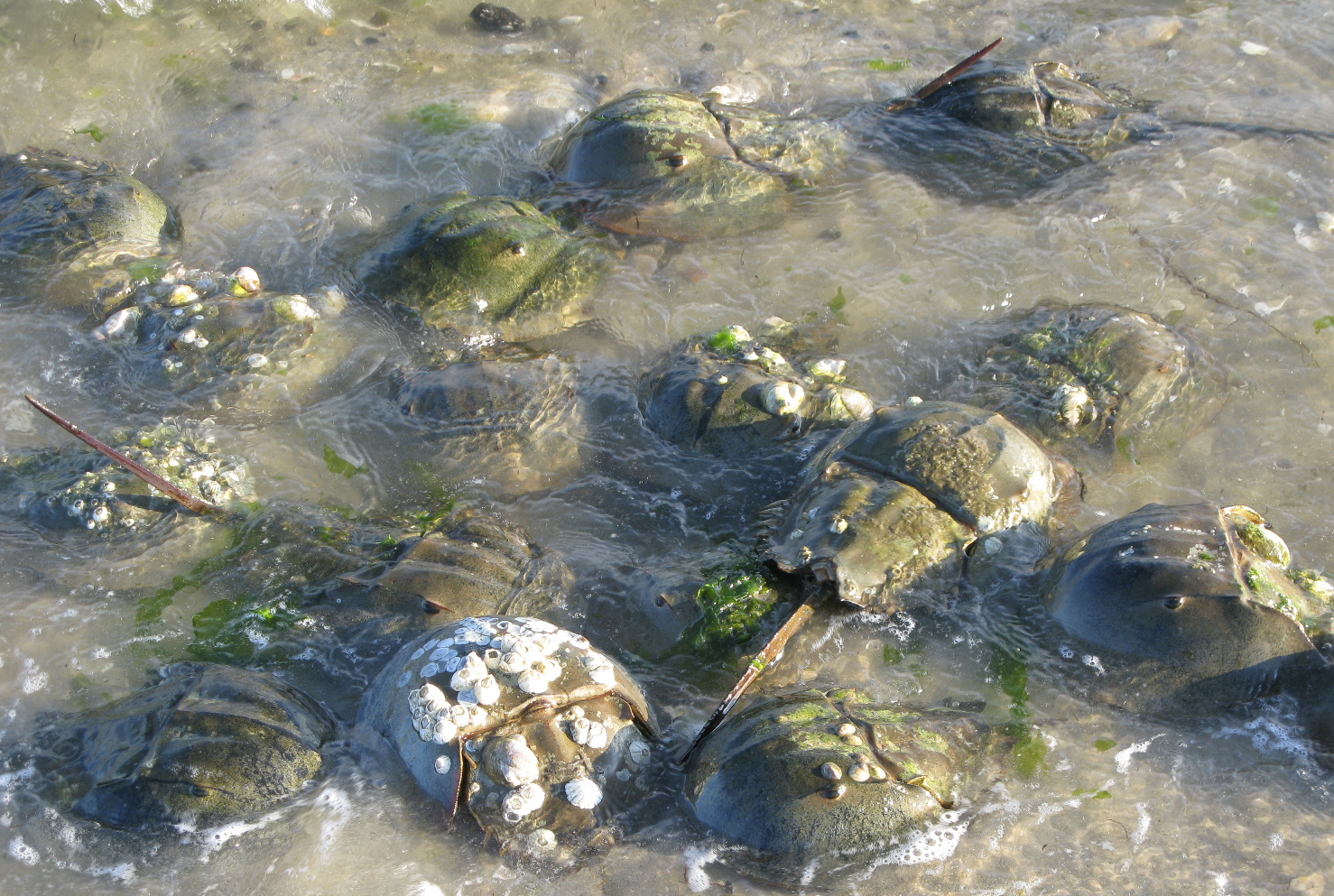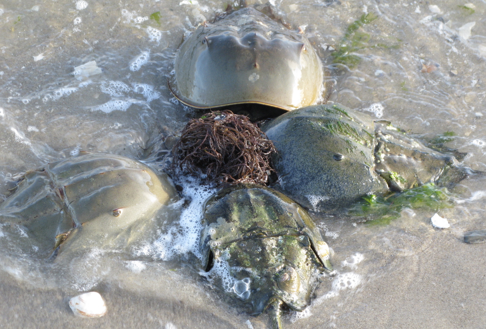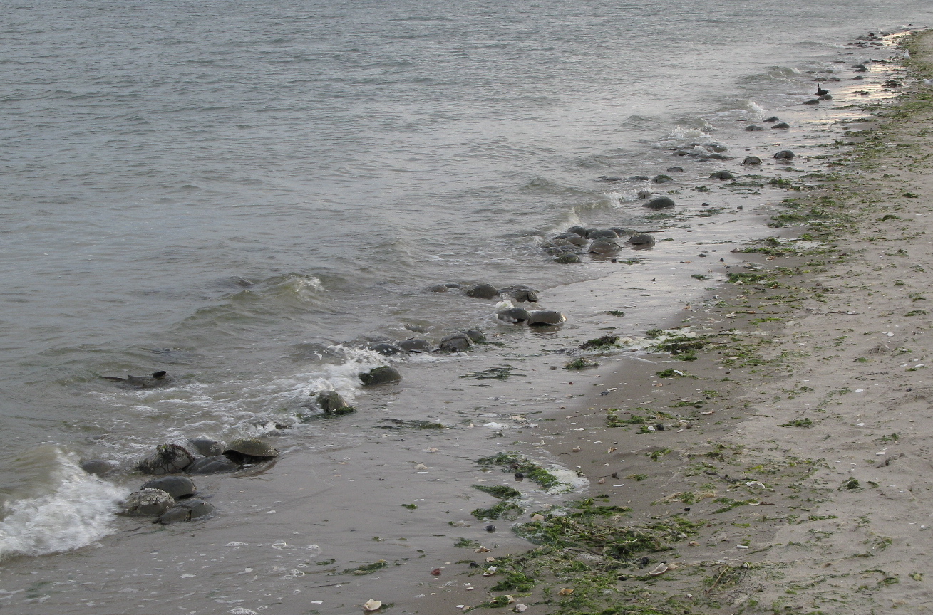 A huddle of males around female mostly-buried in the sand under the clump of seaweed. Horseshoes started their evolutionary journey something like 450 million years ago. They predate the dinosaurs, and, needless to say, the species that chops them into bait, grinds them into fertilizer and chicken feed, and sucks their blood for human medicine. There are four species, three in the Indo-Pacific (where they are also eaten by H. sapiens), one in the Atlantic. Related to the trilobites and the arachnids, they are not crabs; they survived the Permian-Triassic Extinction that killed off nearly all other ocean life. It is fashionable to call them “living fossils,” but that suggests a simplicity that the reality belies.