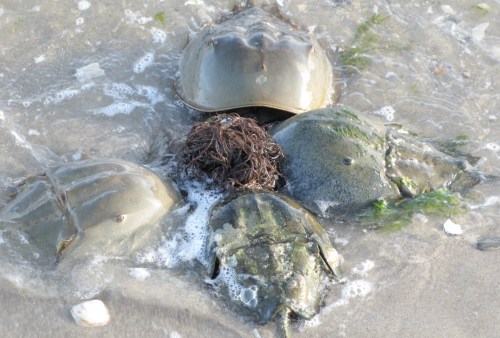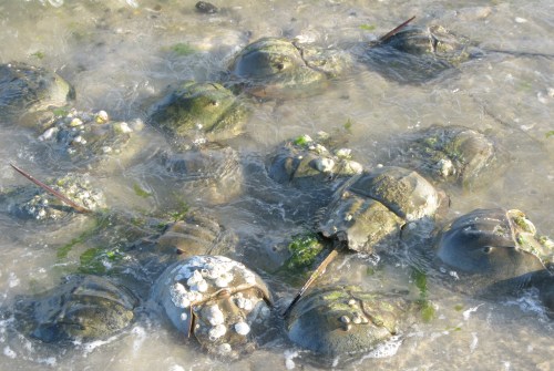 Can you feel it? The Horseshoe crabs (Limulus polyphemus) sure can. It’s spawning season. Here, looking like rocks, are some males awaiting females and clusters of males attached to, and surrounding, females.