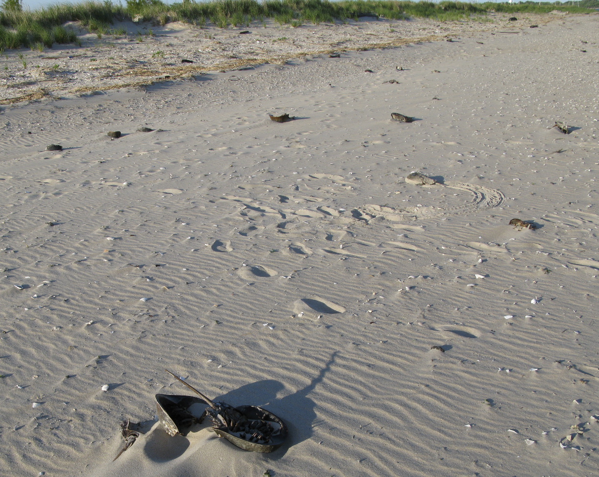 Not all of them return to the sea. There are more than a dozen dead in this photo. Legion are the hazards of being a Horseshoe crab.