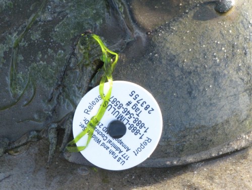 Between the devil (you will know him by his works) and the deep blue sea, there are a lot fewer Horseshoes than there used to be, a situation which has ramified throughout littoral habitats and their food chains. As a result, the animals are much studied, with censuses conducted up and down the coast this time of year. This tag, one of five we saw among the several hundred crabs about an hour before high tide, had only been attached two nights earlier by a team from NYC Audubon.