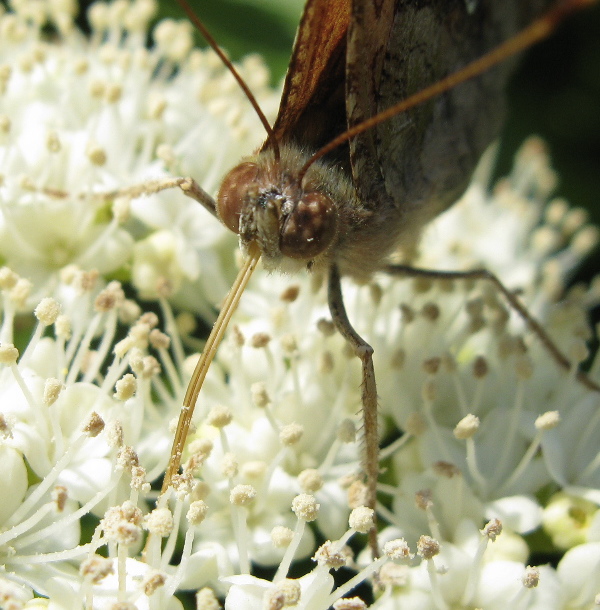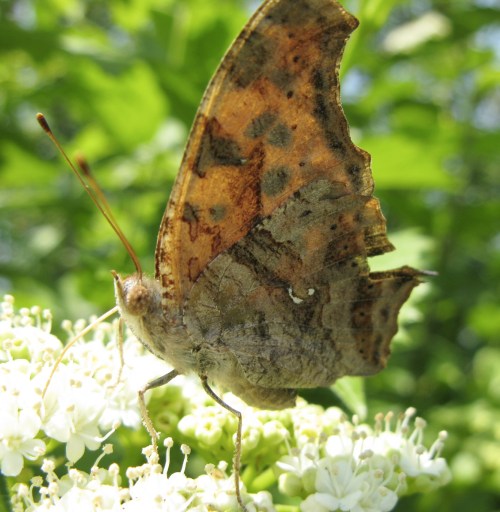 The question mark on a Question Mark butterfly (Polygonia interrogationis) looks a little more like a semi-colon. These and their cousins the Eastern Commas are also called Anglewings more generically because their wings don’t have the rounded shape of most of our butterflies. This one was slurping up Viburnum nectar in Brooklyn Bridge Park recently. Note the double-barreled length of the tongue: