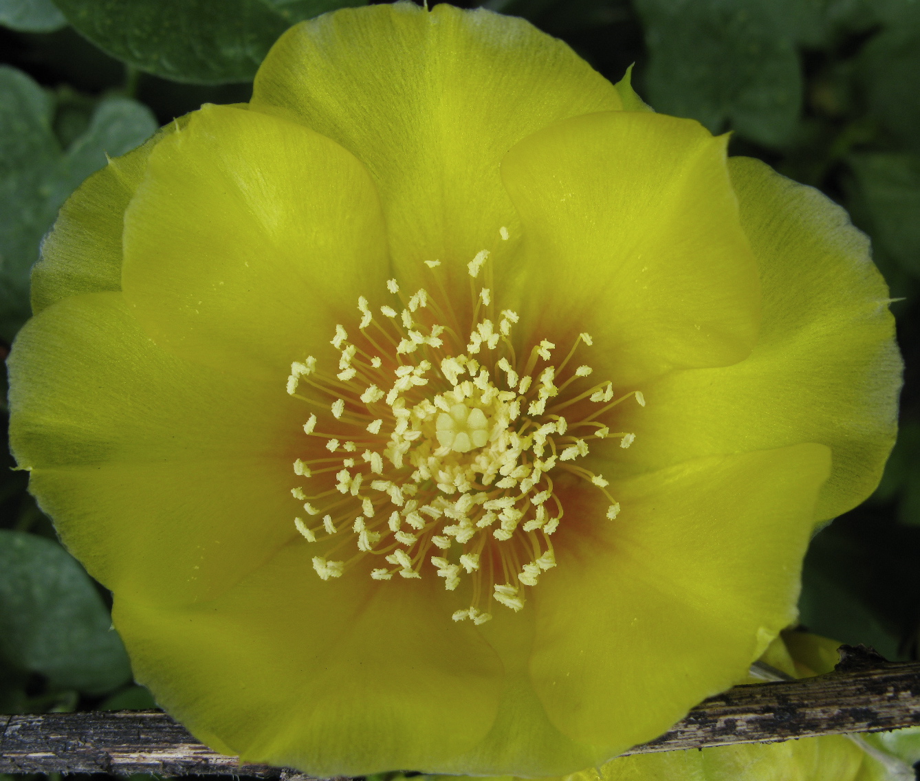 I usually see the Prickly Pear cactus (Opuntia humifusa) out at Jamaica Bay Wildlife Refuge about this time of year, but I haven’t been on the A train in a while. I heard recently that a patch was discovered in Upper Manhattan, which is at the other end of the A train. This flowering specimen, though, is in Gowanus — not where you would expect to find it. It’s planted in a skinny sidewalk garden. A native plant, it reaches into Quebec and is the only widespread cactus in the eastern U.S.