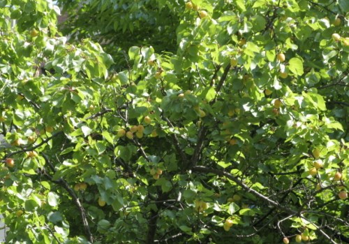 Local fruit trees bloomed early this year… but then they were lucky, because they did not get hit by a frost afterwards. See third picture down on my March 22 post for this plum in bloom. Now it’s full of fruit.