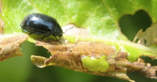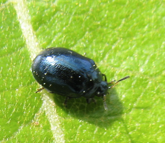 Turns out there are several small, shiny blue-black beetles out there that devour leaves. The Blue or Cobalt Milkweed beetle, the Grape Flea beetle, and the imported Willow Leaf Beetle, which is what I think this is. Plagiodera versicolor.