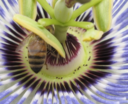 Okay, spiraea and echinacea and little green pollinator in the top photo, clematis (?) and a honey bee in the bottom, but what’s the flower in the middle?