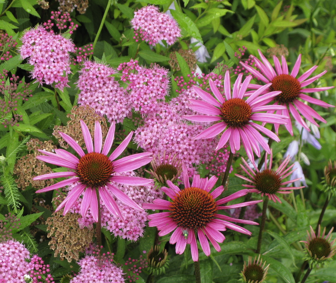 Okay, spiraea and echinacea and little green pollinator in the top photo, clematis (?) and a honey bee in the bottom, but what’s the flower in the middle?