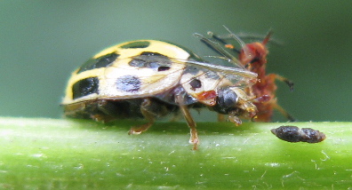 Checker Spot ladybug (Propylea quatuordecimpunctata) munching on an aphid wing.