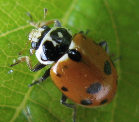 Laval-stage lady beetles are also great aphid-devourers. This is why a number of different species of lady bugs have been introduced into North America over the years: to attack the real destruction aphids can cause. The Checker Spots were one such introduction.