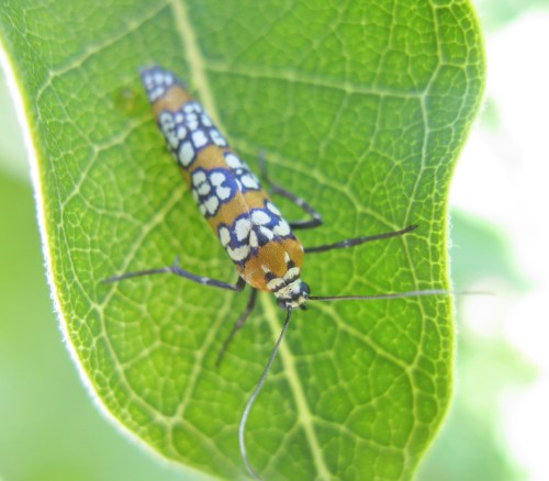 In a curl of milkweed, an Ailanthus webworm moth, cloaked in finery.