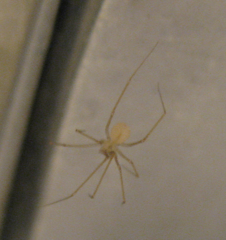 Underneath the bathroom faucet: a small, pale spider.