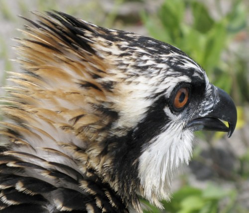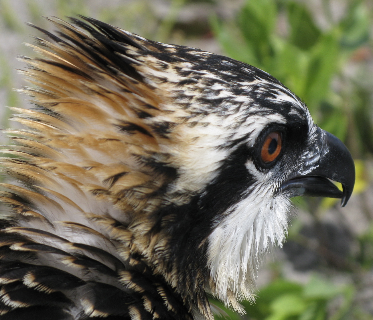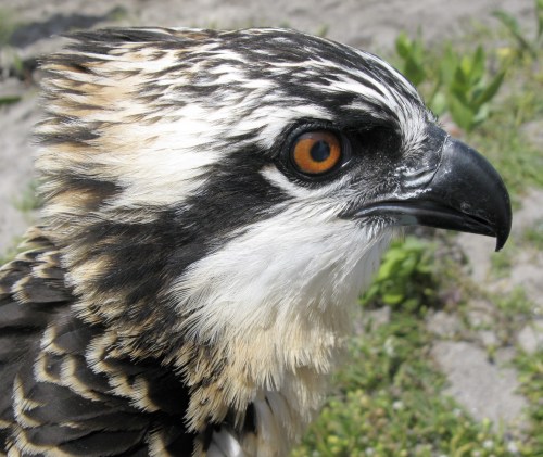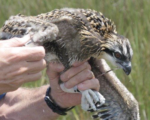 Osprey chicks can be too old to band, because as they near fledging, they may jump off the nest site prematurely to get away from the human who has climbed up to borrow them for a moment. If they aren’t actually ready to fly, this can lead to broken wings. This one, however, was a perfect candidate for banding, still a few weeks away from fledging but big enough to take the band (which our cousins across the Atlantic call “rings”).