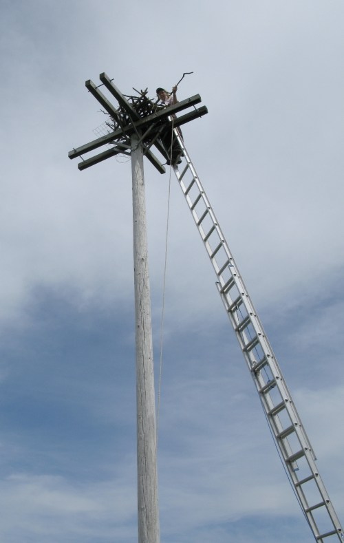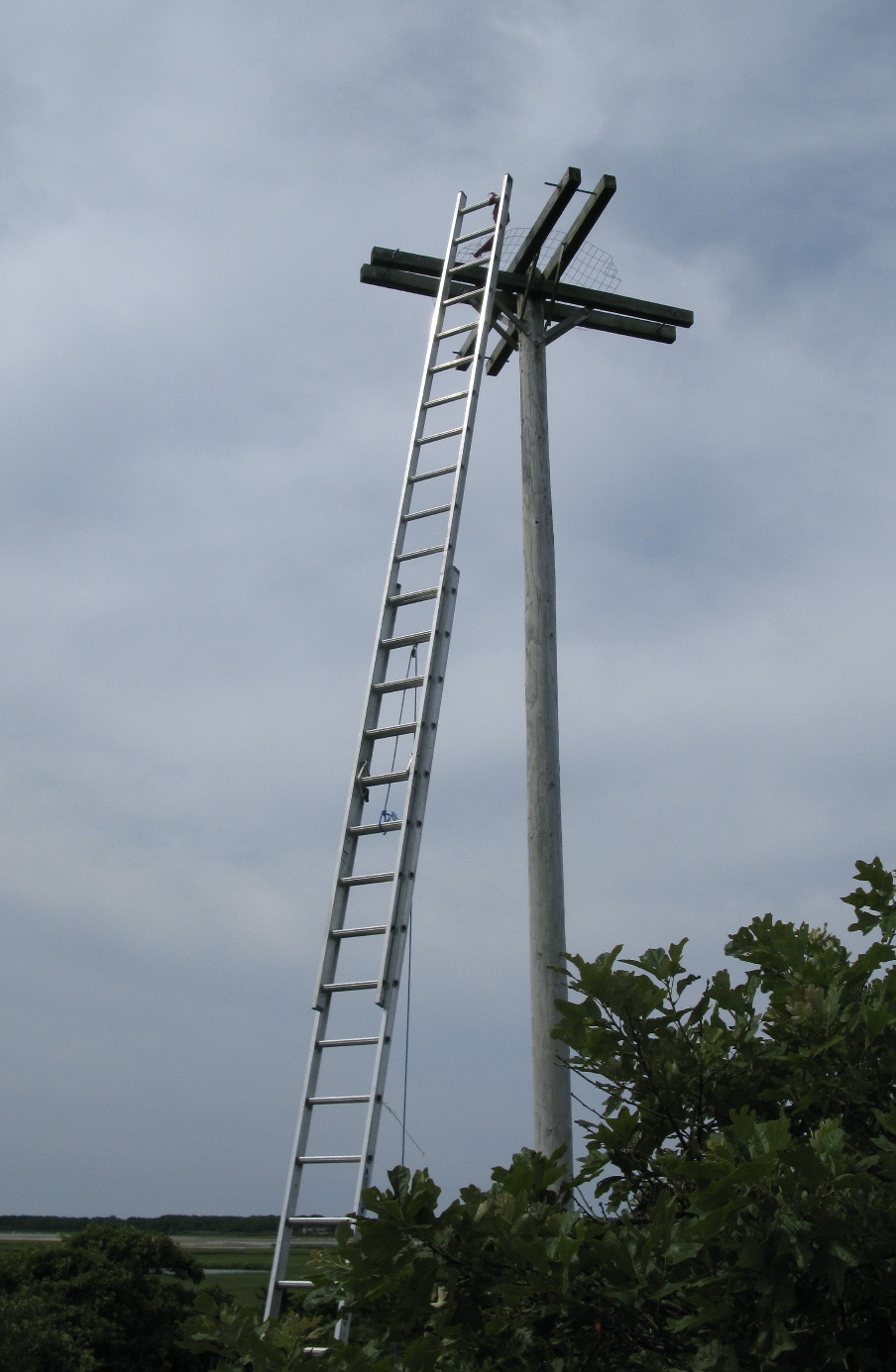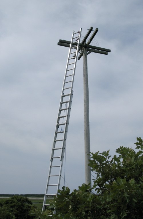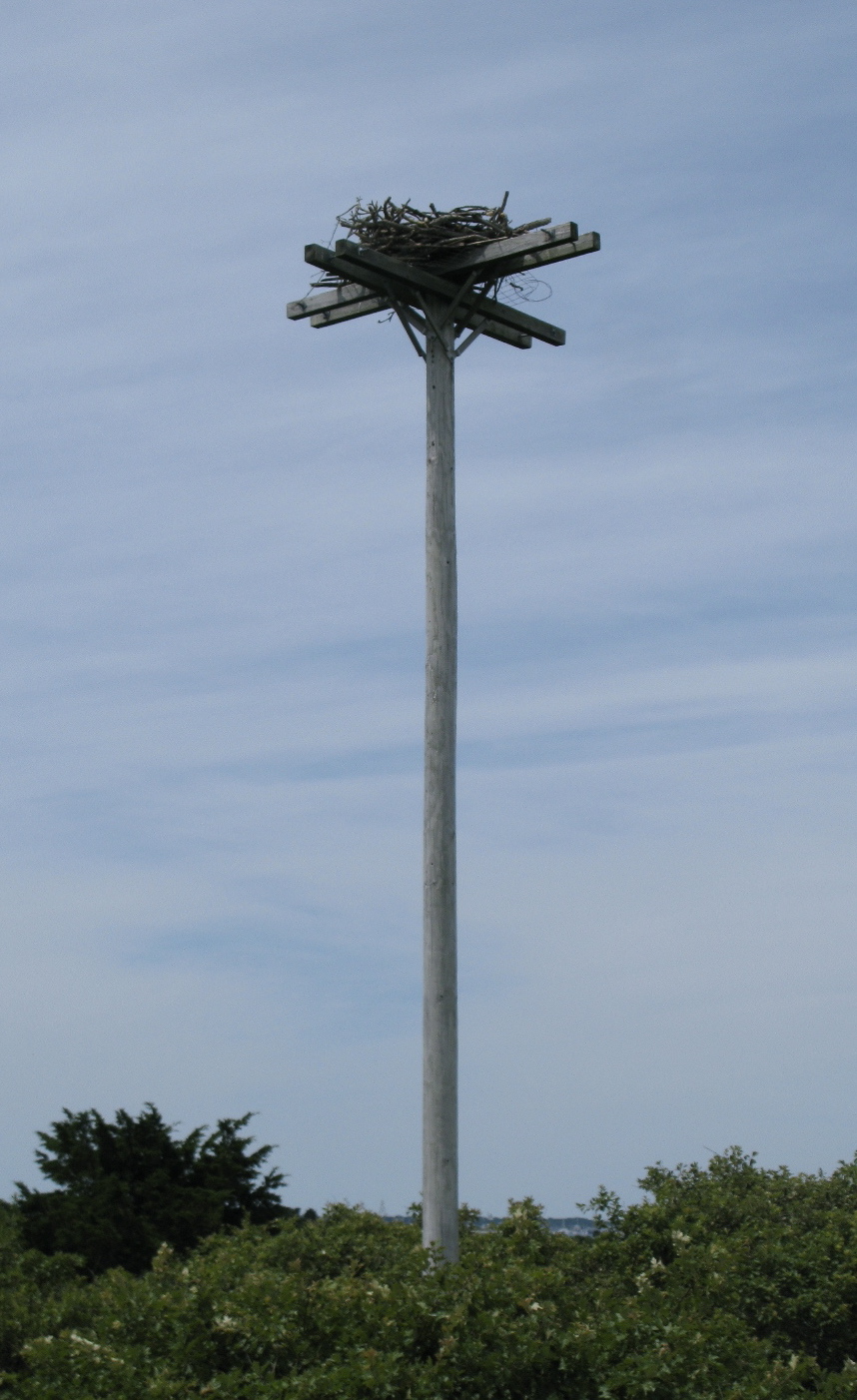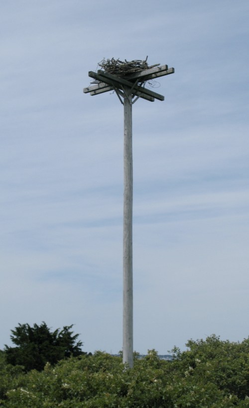The pesticide DDT, applied for decades around the country and world, severely reduced the number of large raptors because it concentrated up the food chain. In the birds, it weakened the chemical composition of eggs so much that adult birds were crushing their own young. The eastern sub-species of the Peregrine falcon was in fact exterminated from the region before DDT was banned. Among several efforts to bring back viable populations of large birds of prey, one was the placement of nesting poles for osprey. Here’s one that was set up recently. It’s had no takers yet.
