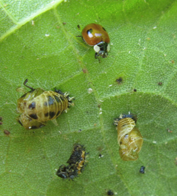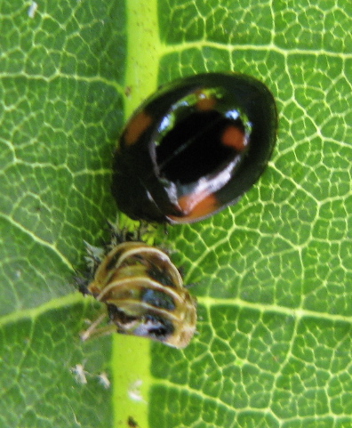 And this, another of the typical Two-Spotted, surrounded by the spent casings, or exuviae of the pupas — although those could be from other lady beetle species, since there are at least three species on these trees now: