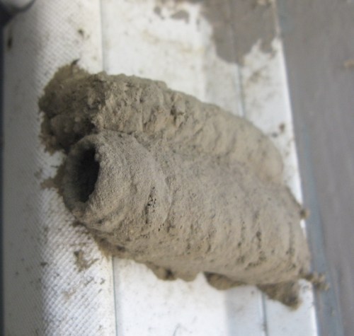 As the name mud-dauber suggests, these wasps build their nests out of mud, individual cells first, then a surrounding stucco of mud around the cluster of cells. Here she was just starting out. One of the inch-long cells had been sealed, the other was still open and unfilled.