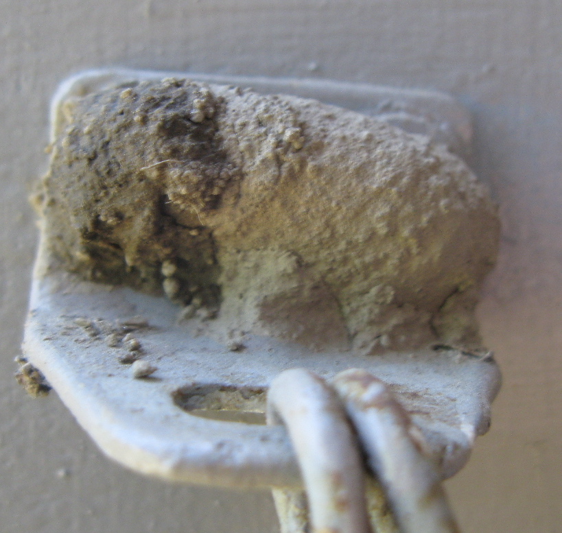 I shooed the wasp out of the house half a dozen times before I found the location of the developing nest. Regretfully, I broke it up and found these four spiders in the sealed cell. But then a couple of days later, in the same door frame, clearly an excellent location — water is dried mud’s worst enemy — another cell appeared. It’s darker on the left hand side of the cell because the mud there is still wet.