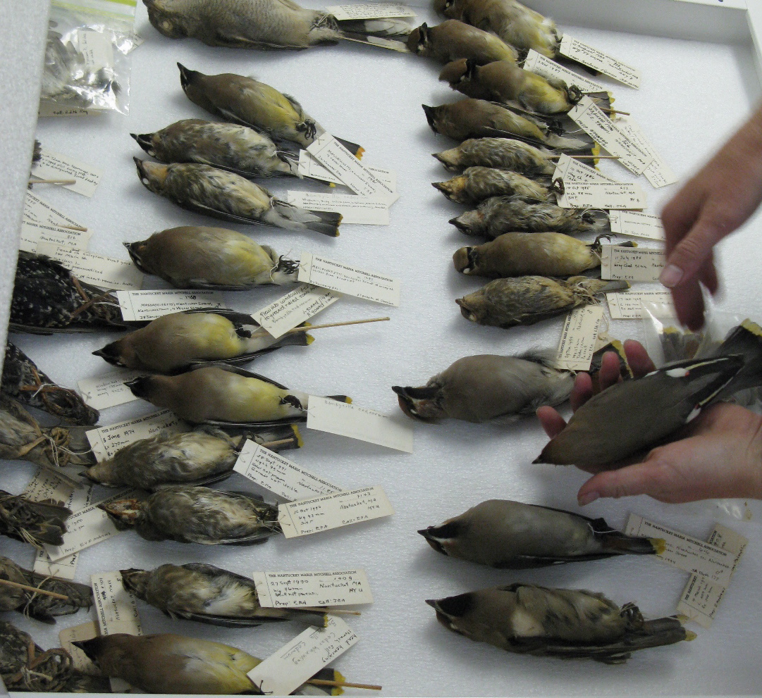 For nearly a century now, it has been illegal to capture and/or kill migratory birds, collect their eggs and nests (once popular hobbies), and even to collect their feathers. This is because such birds used to be slaughtered in such numbers that people began to worry they would be made extinct, as some in fact were. Science is the exception when it comes to collecting bird specimens. Most of the specimens are from accidental deaths. The rare Golden Eagle (not photographed) in this collection hit a power line. The Bohemian waxwings (in the 5th photo), not normally found at our latitude, were the result of an irruption some years ago. Unfortunately, they died in droves on the island. A Peregrine falcon (not photographed) in the collection had been banded in Lawrence, MA, before wending its way south to the island, where it was struck by a car. All a bit of a bummer, to be sure, but hopefully, in being preserved and recorded, they can contribute something to our knowledge of the species. And hopefully that knowledge is something we can use to defend and foster the complex web of life that surrounds us, that we, in fact, are a part of.
