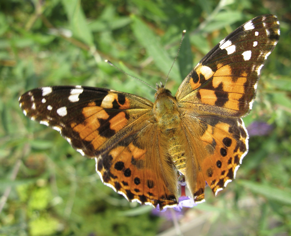 Painted Lady butterflies (Vanessa cardui) are all over the city. Yesterday I counted a dozen at one flowery corner in Gowanus, and another dozen around a couple of butterfly bushes in Brooklyn Heights. This species is similar to the American Lady butterfly (Vanessa virginiensis), as you might expect for a genus-mate. Here’s an American Lady I photographed back in April: