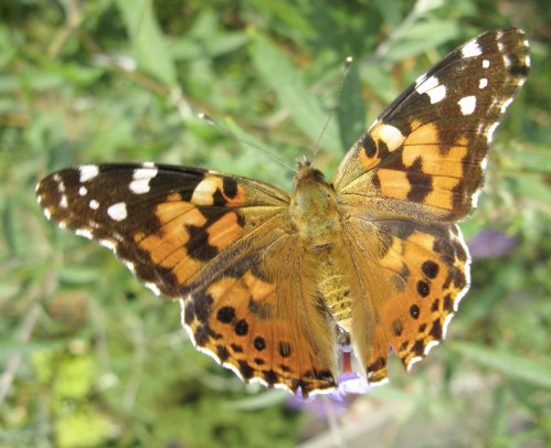 Painted Ladies are a migratory species, moving northwards by the millions during the spring. They are sensitive to cold winters, so we should be seeing more and more of them in the future, barring other factors (not that other factors can be barred). They can have more than one brood during the year in our region, and one has obviously just emerged from its metamorphosis. Find some more data and photos of their caterpillar stage here.