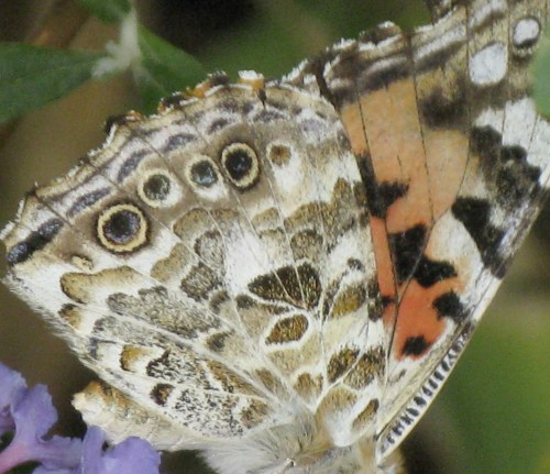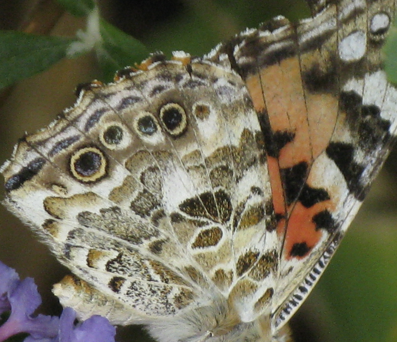 The spots on the hindwings are also different. The American’s are blurrier. But these are easier to see when the insect has its wings closed. There are two large “eyespots” on the American’s hindwing (sorry, no picture) and four smaller ones on the Painted’s: