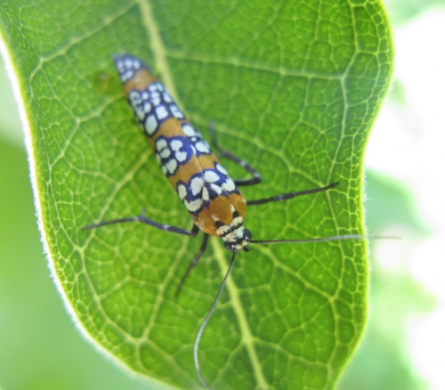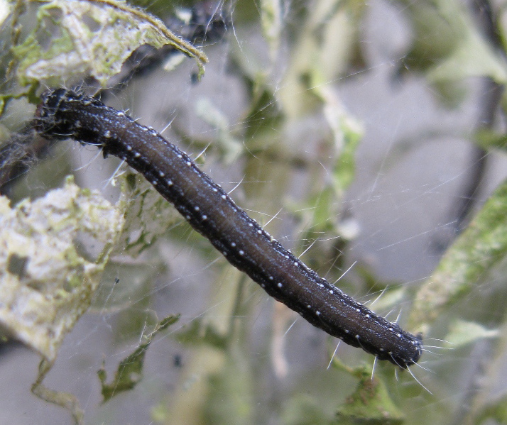 I was working my way up to taking a picture of the Ailanthus sapling that appeared this summer in a crack in the concrete in the Back 40. I was looking forward to a tree growing in Brooklyn, at least until the landlord saw it. But the Ailanthus Webworms got to it before I did. And they did a number on it. Atteva aurea is another of the communal caterpillar species who cover their handiwork in silk.