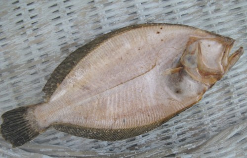 And this is what the underside (right-hand side in the Summer’s case; starboard to the sailor) looks like. They can change the color and pattern on their topside to match the ocean habitat below them (sandy, muddy, etc.), but their underside is quite plain. No need for camo. you will only see this side when you pull it out of the water, and as a major commercial fish, they are pulled. This was a youngster, about five inches long; they can get up to 20 inches and 3 pounds. Found up and down the East Coast, especially between Massachusetts to the Carolinas. They have a very wavy swimming motion, like ribbon in the water.