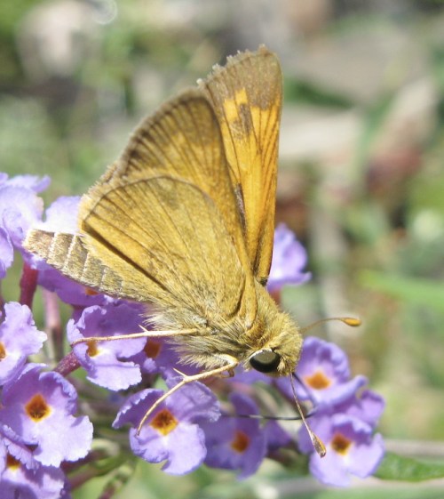 One of the numerous small butterfly species called skippers in the family Hesperiidae. Many look quite similar to each other, so I gave this one to the Bugguide crew, and last I checked there was no response. I usually see them skipping about meadows and overgrown lawns; this one was on a butterfly bush in Brooklyn Heights. Hesperiidae usually have larger eyes than other butterfly families.