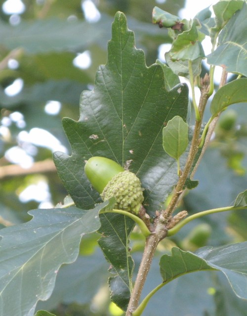 The Chestnut Oaks, Quercus montana, are ripening in Prospect park. This species’ common name stems from the leaves, which are somewhat chestnut-like, although the acorn, over an inch long in this species, is all oak.