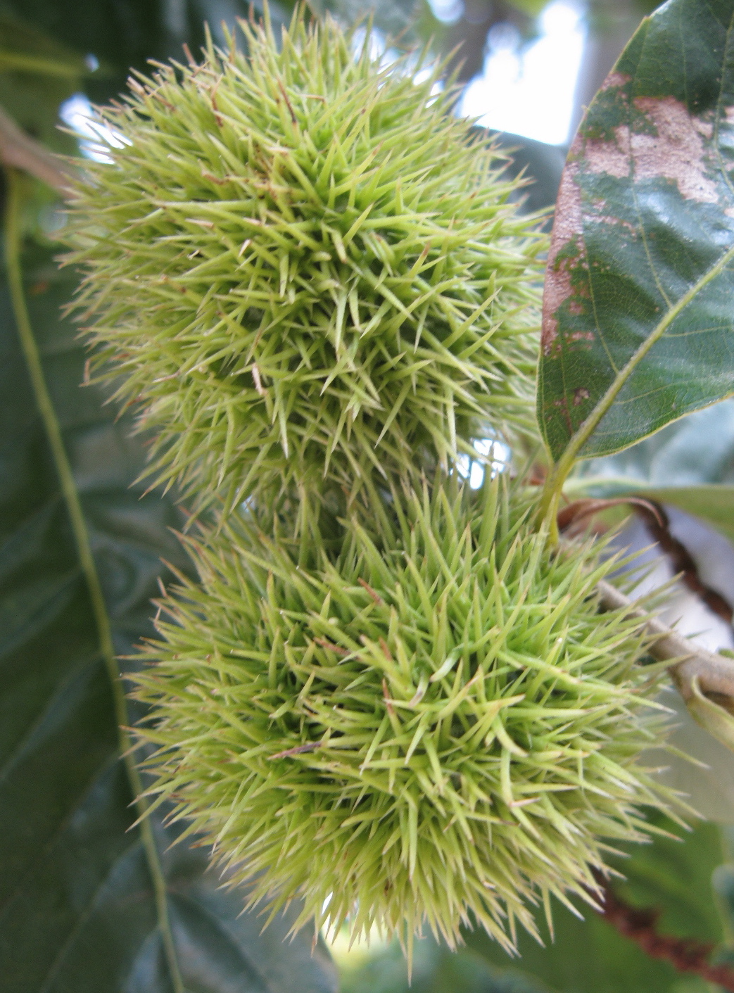 So whence this confusing multi-use name “chestnut”? It goes back to the Old English chesten, the name for the sweet chestnut of Eurasia, the C. sativa of above. Chesten has a Greek source, the name for the nut of either Pontus, on the Black Sea, or Thessaly, which would be the same nut, methinks.