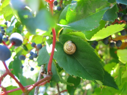 This snail was higher than I am. Anybody know that small grape-like fruit?