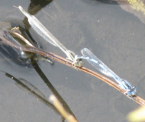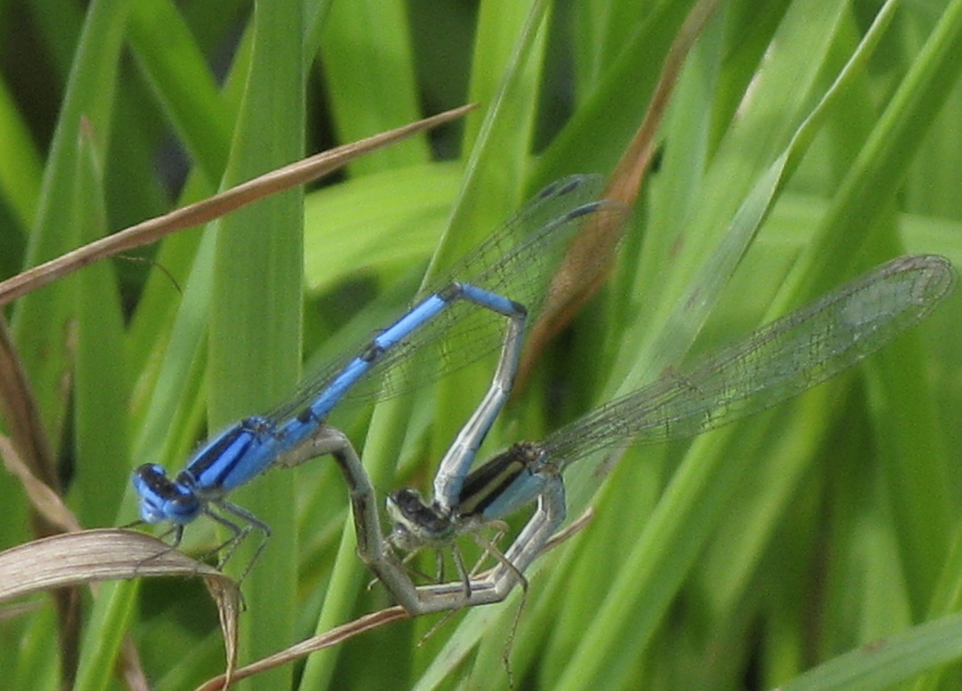 Bluet damselflies mating. The bright male clasps the female right behind the head.