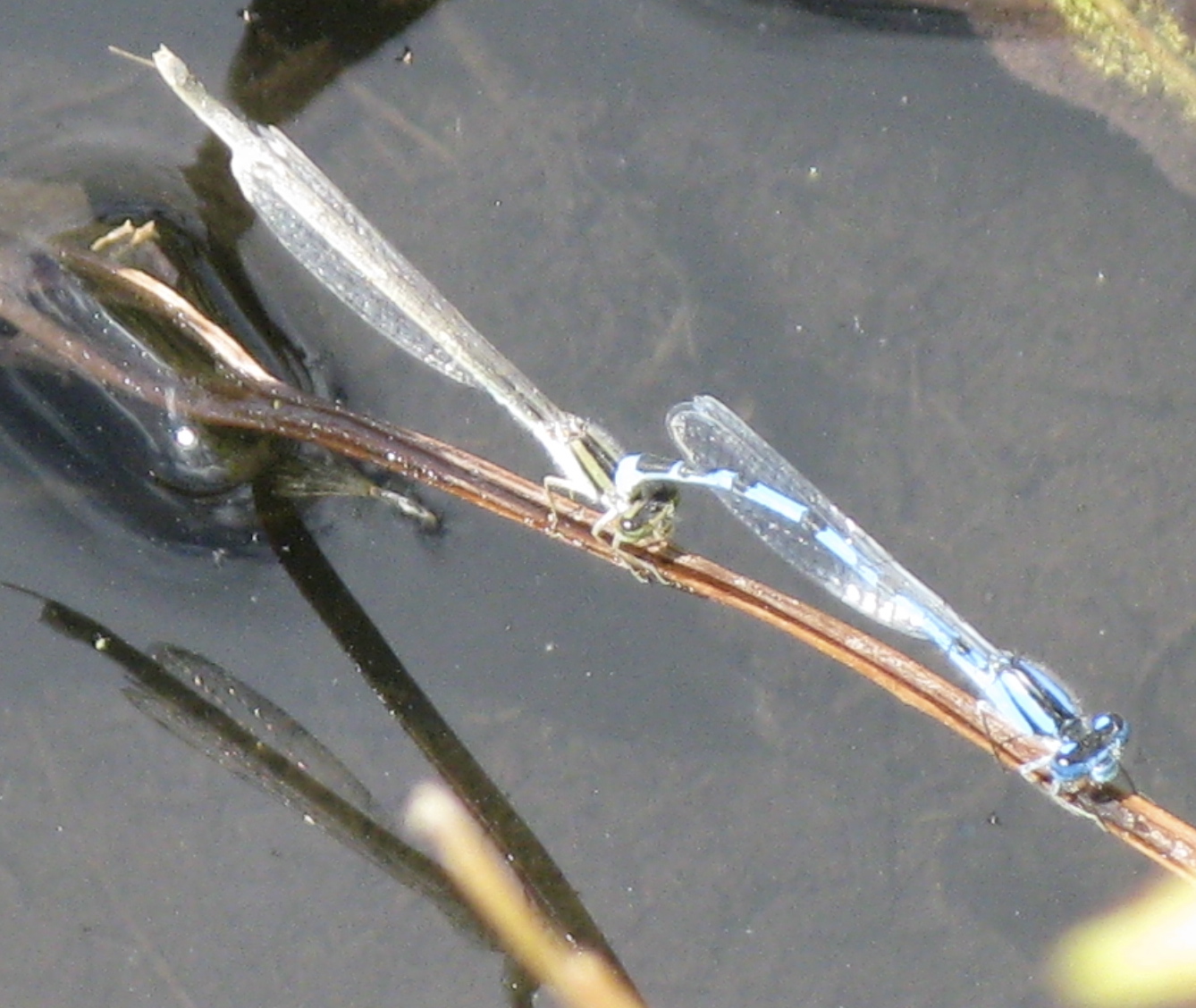 The female curves her abdomen around underneath herself to latch onto the second abdominal segment of the male, where he keeps his business (“anterior laminae”) for the ol’ genetic transfer.