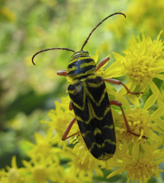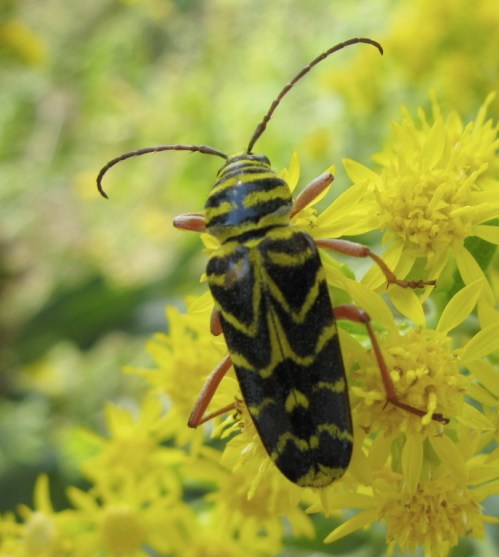 A wasp-mimicking beetle. At over an inch long, this striking creature is the Locust Borer, Megacyllene robiniae. It’s one of the longhorn beetles; its larva bores into black locusts, while adults like this one eat goldenrod pollen. The beetle was made for this park with its black locust trees and goldenrod galore. Here’s a view of the striped underside:
