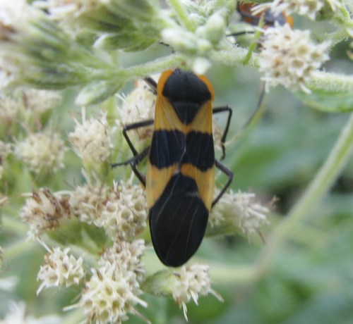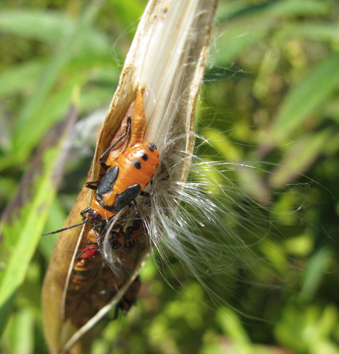 Larva of Large Milkweed Bug, Oncopeltus fasciatus. Adult: