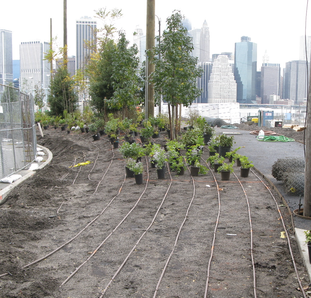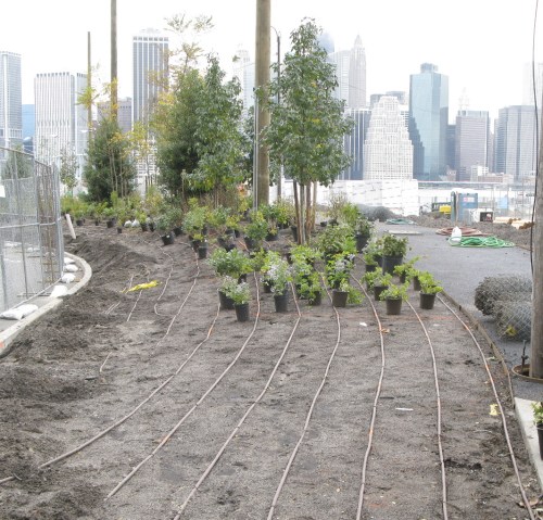Like tracks into the future, irrigation lines underline the new plantings at Pier 5, Brooklyn Bridge Park.