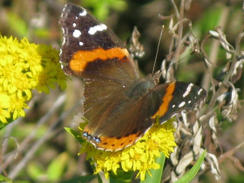 This Red Admiral (Vanessa atalanta), a species that flocked through the region back in May, has had a big chunk of its underwing taken out.